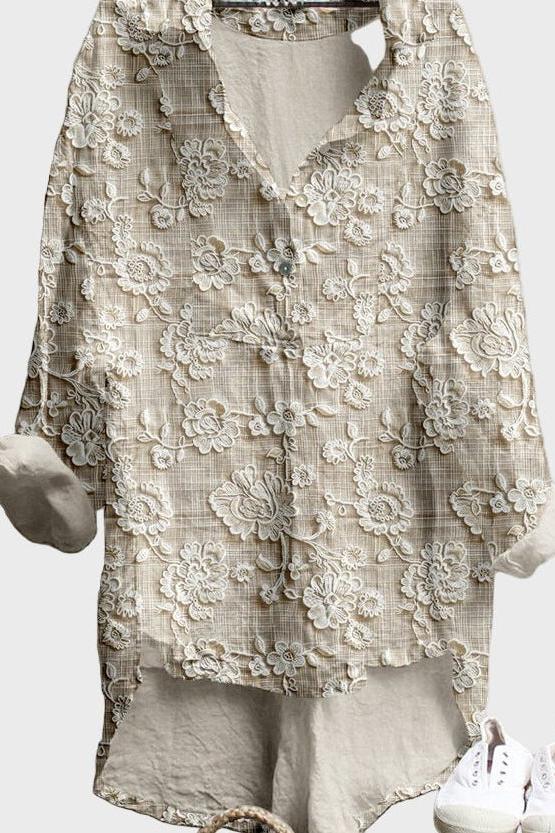 - Blomstret mønster og farvetoner: Subtile detaljer løfter udtrykket
