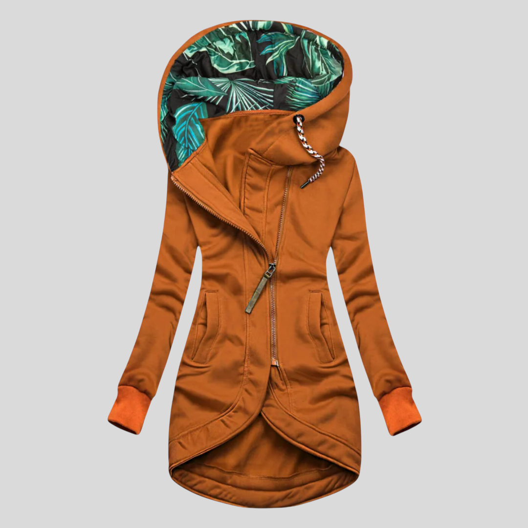 Opfrisk din stil med denne jakke i et moderne snit og med upåklagelig forarbejdning. Det asymmetriske design kombineret med en hætte foret med et tropisk mønster skaber et unikt og autentisk udtryk. Perfekt til dem, der søger komfort, funktionalitet og elegance i hverdagen.