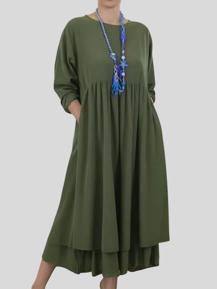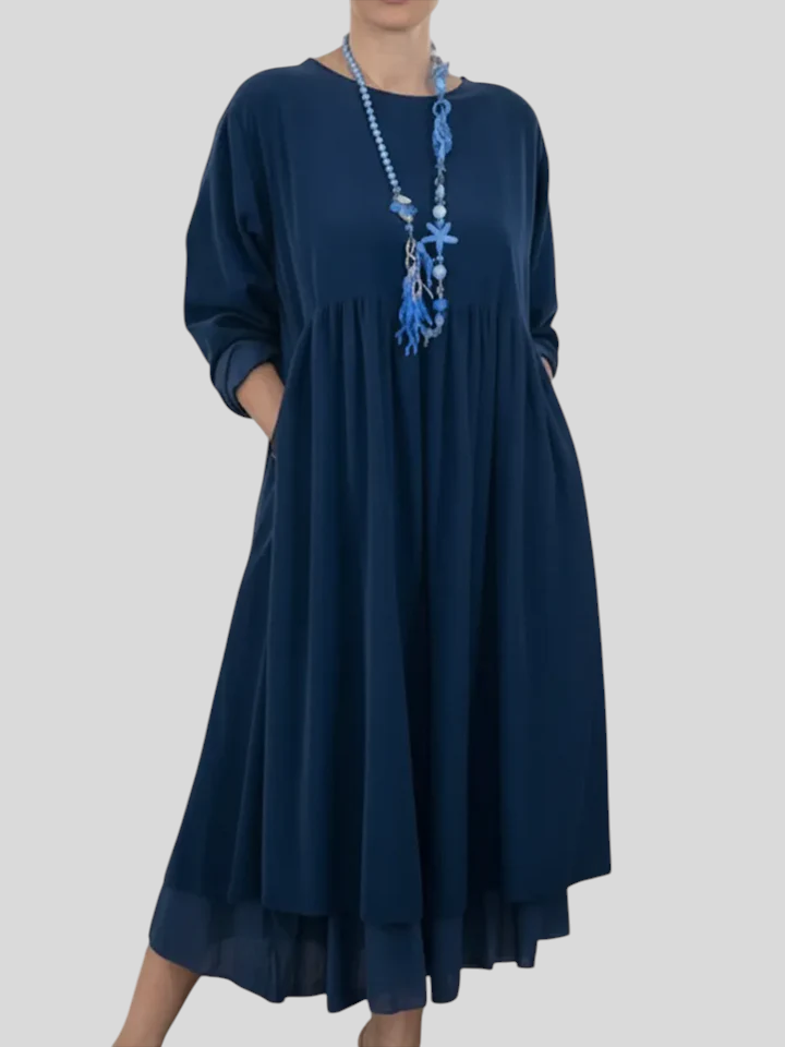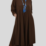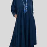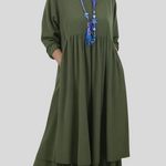 Denne kjole er skabt til dig, der ønsker maksimal komfort kombineret med et feminint og tidløst udtryk. Den løse pasform giver et naturligt og flydende fald, som sikrer bevægelsesfrihed og en behagelig fornemmelse hele dagen. Det afslappede design med diskrete rynkedetaljer tilfører lethed, mens midilængden gør kjolen velegnet til mange forskellige anledninger. En alsidig kjole, der nemt kan styles til både afslappede og mere velklædte looks.