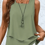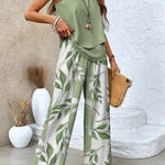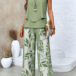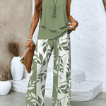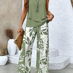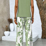 - Farve og mønster: Olivengrøn top med rolig tekstur; bladprintede hvide bukser for subtil bevægelse.