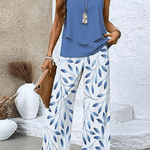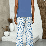 - Indigotone top i elegant kontrast til hvide bladprint bukser fremhæver nordisk æstetik og omtanke for detaljer.