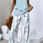 - Design og print – En ensfarvet himmelblå top kombineret med blomsterprintet i bukserne giver raffineret og tidløst udtryk.