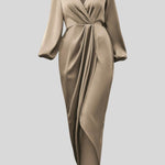 Inger | Maxi kjolen inviterer til nattens elegance gennem et flydende, let glansfuldt stof, der falder som silke. Den dybe V-hals fremhæver dekolletten med diskret drama, mens pufærmer og den rynkede talje skaber en sofistikeret silhuet i bevægelse. Sidesplitten tilfører et moderne præg uden at ofre kjolens tidsløse poesi, og hvert sting vidner om håndværkets omhyggelighed. Med fokus på oprindelse, arv og langtidsholdbar kvalitet er Inger designet til at vare gennem sæsoner og blive en ægte samlerappel.