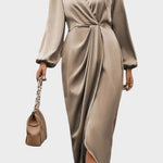 - Silhuet og detaljer: Dyb V-hals, pufærmer og rynket talje skaber en sofistikeret, naturlig form i bevægelse.