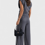 - Håndværk og konstruktion: Omhyggeligt sammensat asymmetrisk top og brede bukser for en komfortabel, holdbar pasform.