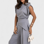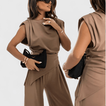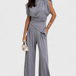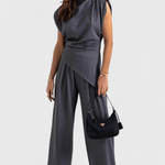 Josefine | Sofistikeret sæt er sculptural og moderne i sit udtryk. Den asymmetriske top med draperede skuldre møder brede bukser, der forlænger silhuetten og følger bevægelsen med naturlig elegance. Det lette satinagtige stof giver en diskret glans og løfter sættet fra hverdagen til lounge- eller eventlook. Designet fremhæver håndværkets omhu og materialernes kvalitet og er skabt til særlige anledninger og raffinerede hverdagslooks. Begrænsede antal tilgængelige sæt gør hvert køb eksklusivt og attraktivt for samlere af tidløst design. Josefine udtrykker kvalitetsarv, der holder i årevis og passer dagens tempo uden at gå på kompromis med komfort.