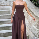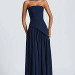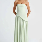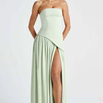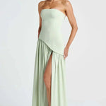 - Bevægelse og silhuet – Off-shoulder-modelens struktur fremhæver silhuetten med en asymmetrisk talje og draperet, fuldt langskørt med høj splits for naturlig bevægelse.